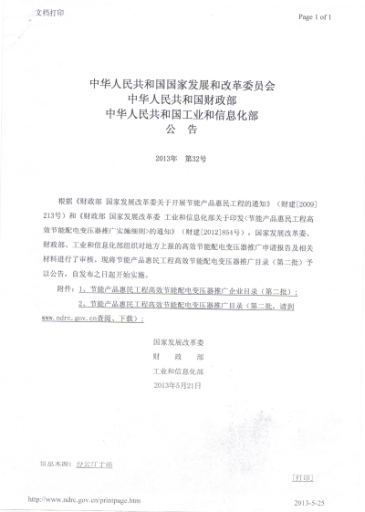 近日,國家發(fā)改委、財政部、工信部正式公布《節(jié)能產(chǎn)品惠民工程高效節(jié)能配電變壓器推廣企業(yè)目錄(第二批)》(http://www.ndrc.gov.cn/zcfb/zcfbgg/2013gg/W020130524556402255141.pdf ) ,我公司生產(chǎn)的節(jié)能配電變壓器成功入圍名單之列。